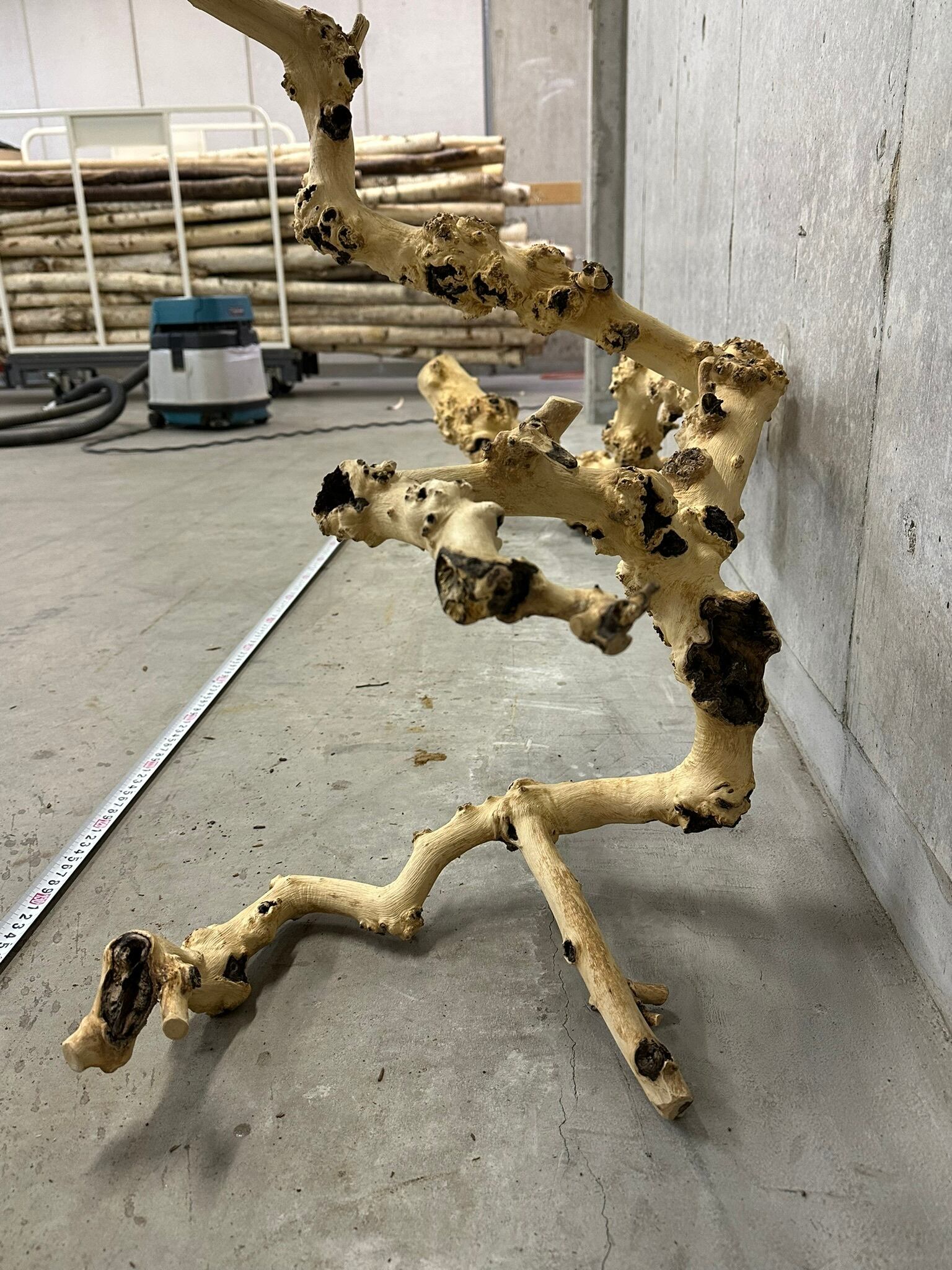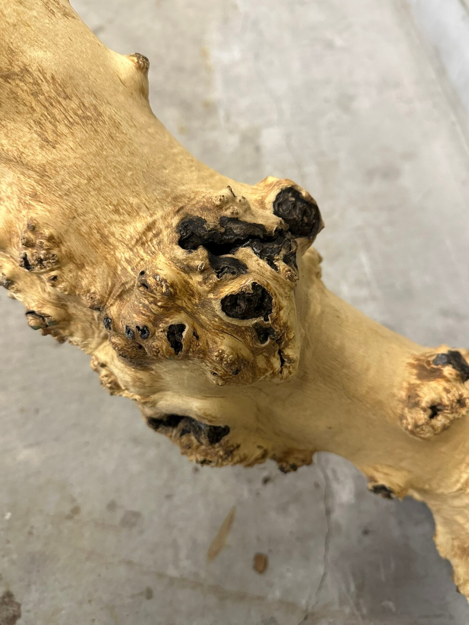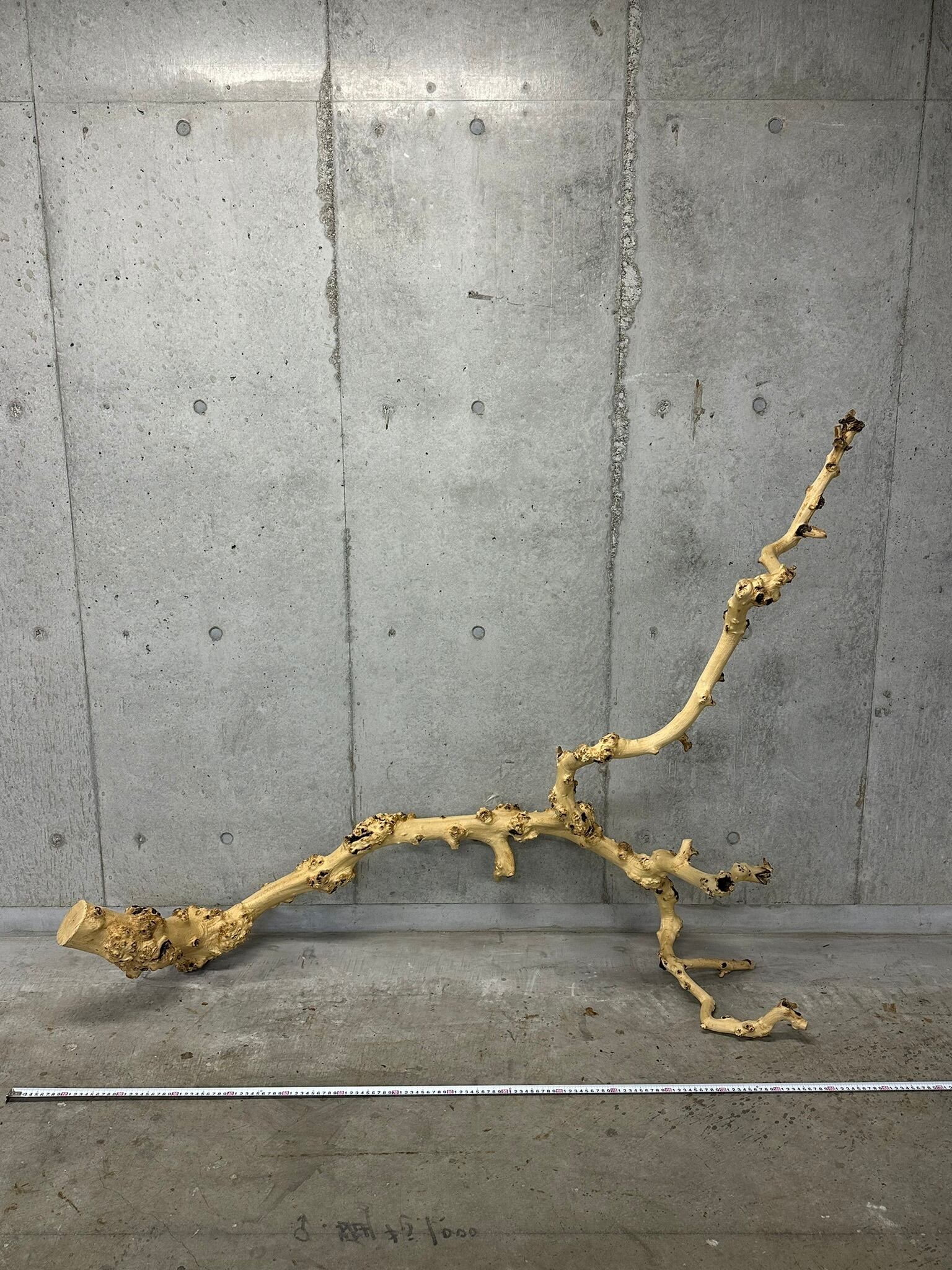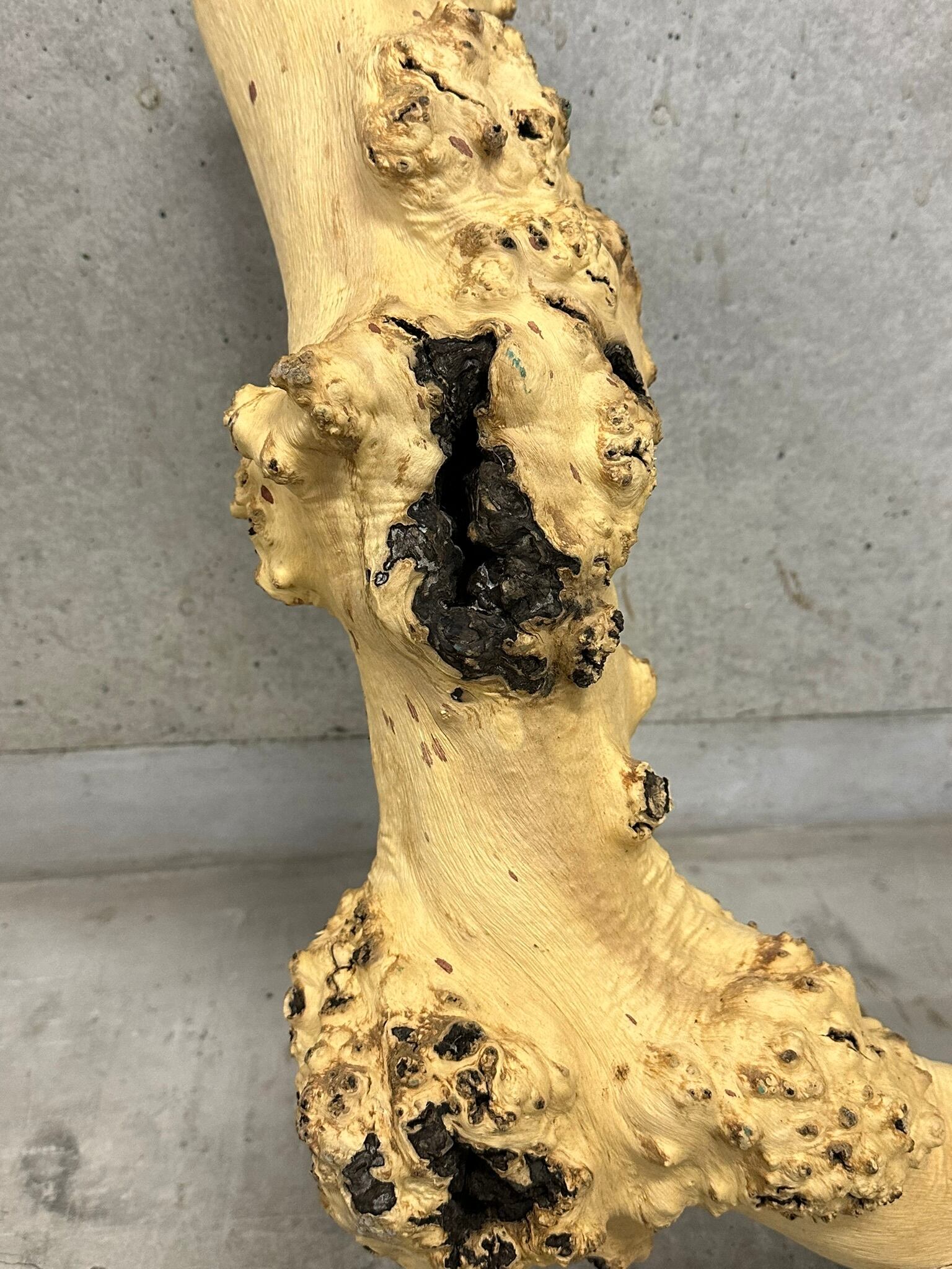 異様な形状の黒柿の変木です。このままでオブジェとしてお部屋のインテリアとしてディスプレイにお使いいただいてもいいですし、どんな杢が出てくるのか、カットしてボールペンや一輪挿しなどの木工細工を楽しまれるのも良し。創造力が無限に広がります。
